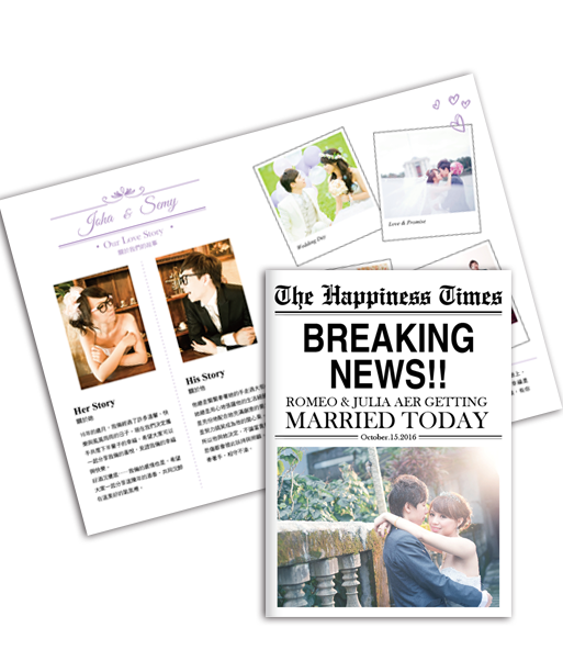 時下喜宴給賓客最熱門的禮物,藉由婚禮報的方式,呈現給來賓對新人最完整的認識 請翻閱以下互動婚禮日報